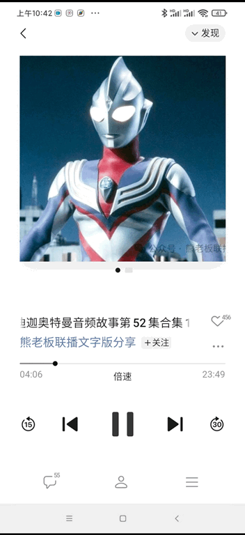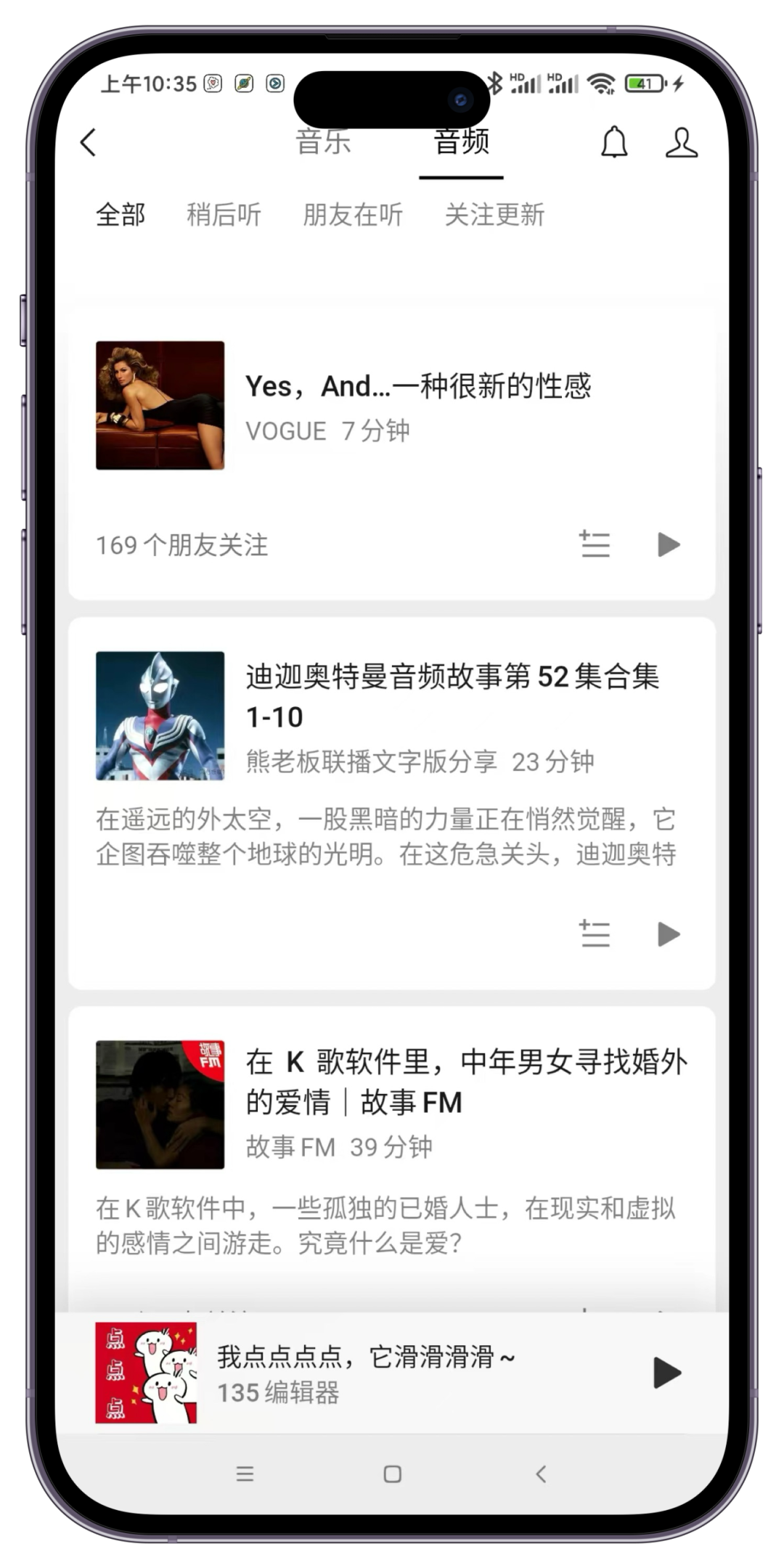 在「發(fā)現(xiàn)」-「聽(tīng)一聽(tīng)」-「音頻」中,我們可以看到界面是進(jìn)入播放狀態(tài)的,上下滑動(dòng)可以隨時(shí)切換自己感興趣的音頻內(nèi)容。