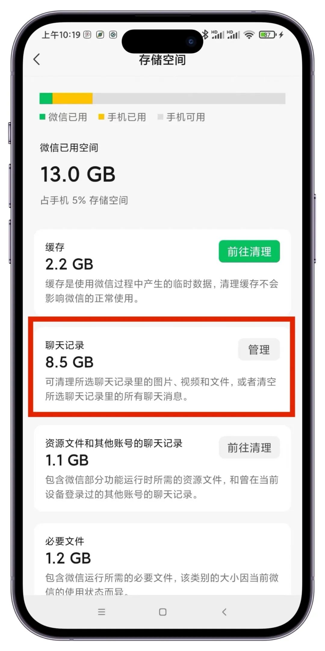 在「存儲(chǔ)空間」界面中,點(diǎn)擊聊天記錄區(qū)域中的管理,會(huì)彈出:清理圖片、視頻和文件,刪除聊天記錄。