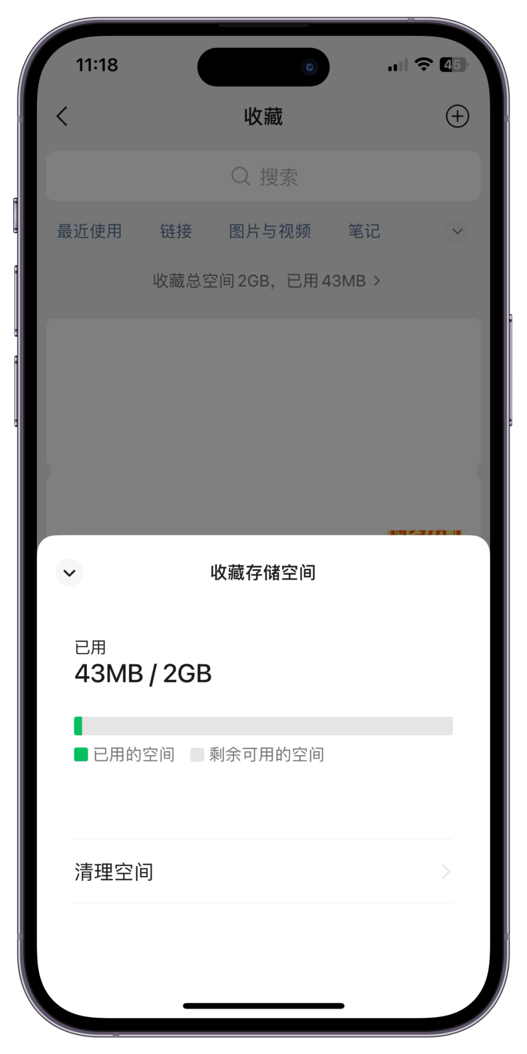 點(diǎn)擊「收藏總空間2GB,已用XX」,會(huì)彈出存儲(chǔ)空間菜單,我們可以選擇「清理空間」清理收藏中不需要的內(nèi)容,釋放內(nèi)存。