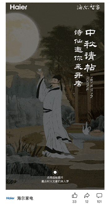 這是來(lái)自海爾的中秋節(jié)推文內(nèi)容,他們?cè)谖闹幸肓宋逦辉?shī)人的經(jīng)典詩(shī)句,并以一種詼諧幽默的方式重新詮釋,使之與海爾旗下的多款產(chǎn)品一一對(duì)應(yīng)。這種跨界融合的方式,不僅極大地提升了推文的趣味性和可讀性,還巧妙地在讀者心中留下了對(duì)產(chǎn)品深刻而獨(dú)特的印象,實(shí)現(xiàn)了良好的宣傳效果,非常值得各位品牌方們借鑒學(xué)習(xí)。