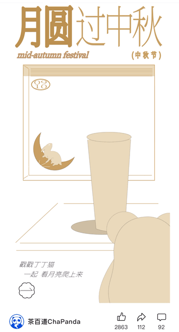 談及中秋節(jié)標(biāo)志性的特征,非月圓之夜莫屬,我們可以圍繞“月亮”這一創(chuàng)意思路,發(fā)揮想象力,進(jìn)行推文創(chuàng)作。比如像茶百道這篇中秋節(jié)主題的推文,在開(kāi)篇部分就巧妙融入了月亮形態(tài)變化的元素,通過(guò)點(diǎn)擊換圖的交互效果,讓用戶見(jiàn)證月亮由缺至圓的過(guò)程,不僅增強(qiáng)了閱讀的趣味性,也讓中秋的節(jié)日氛圍躍然屏上,令人沉浸其中。