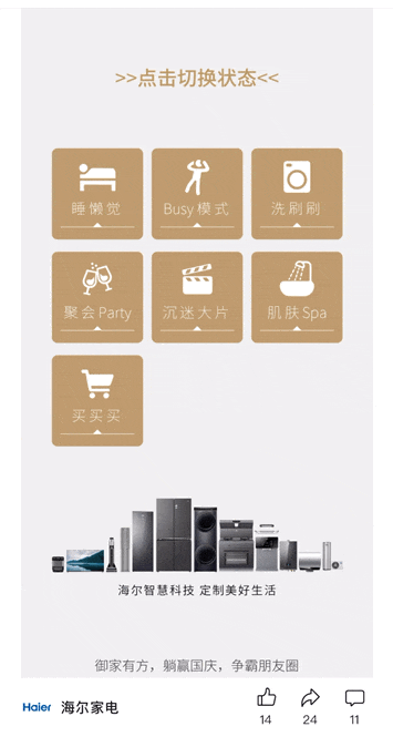 面對國慶假期去哪里都是人從眾的情況,海爾品牌為大家?guī)砹艘环菡夜ヂ?,精心?guī)劃了國慶七天的豐富活動。通過切換模式的創(chuàng)意,引導(dǎo)用戶點擊探索每日內(nèi)容,而在攻略中,海爾巧妙地融入自家產(chǎn)品,使讀者在享受攻略樂趣的同時,也能了解到其產(chǎn)品特性。