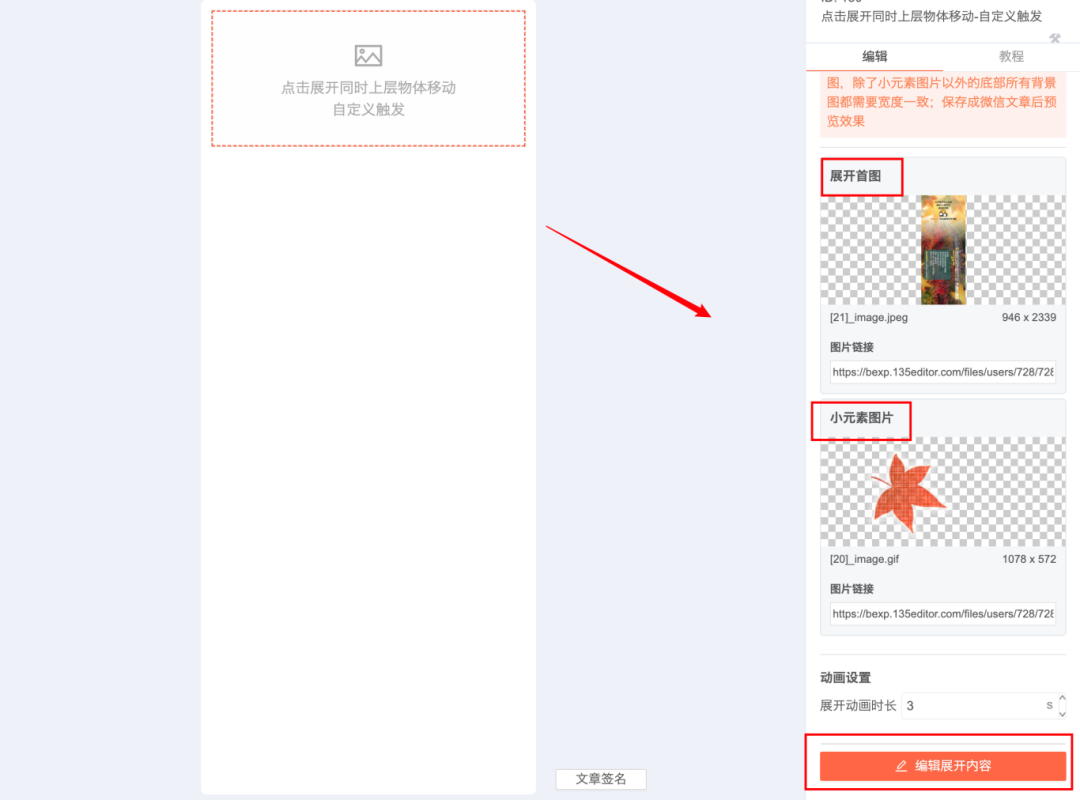 這里需要注意的是小元素圖片部分在設(shè)計(jì)時(shí),需要做成png格式的透明圖。同時(shí),展開首圖和展開后圖片這兩個(gè)部分的圖片素材寬度需要保持一致。