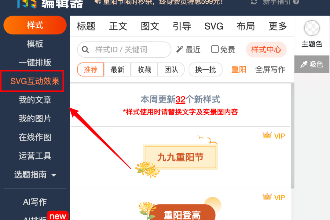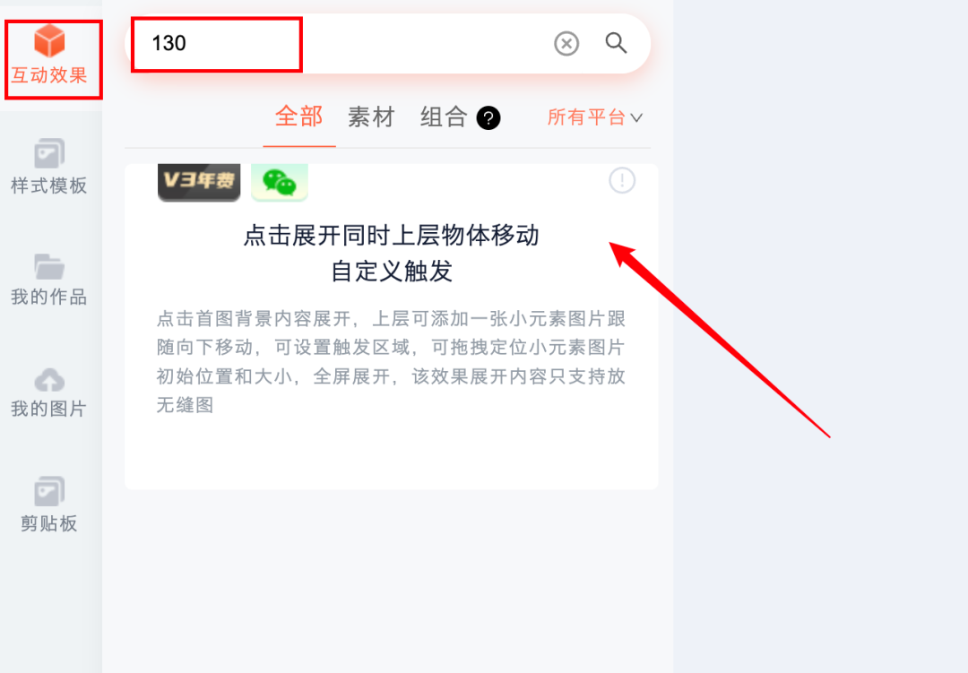 在135編輯器頁(yè)面左側(cè)選擇【SVG編輯器】——【進(jìn)入SVG編輯器】,在互動(dòng)效果中搜索ID:130,將該效果放在編輯頁(yè)面。