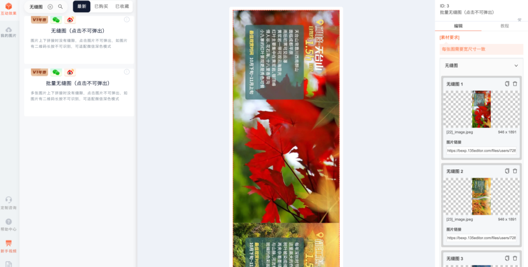 ② 添加展開后內(nèi)容部分的圖片:點(diǎn)擊【編輯展開內(nèi)容】,在這里選擇無(wú)縫圖組件,可以在效果中心搜索無(wú)縫圖,選擇批量無(wú)縫圖組件,ID:3。將展開后需要用到的圖片添加到組件中去。