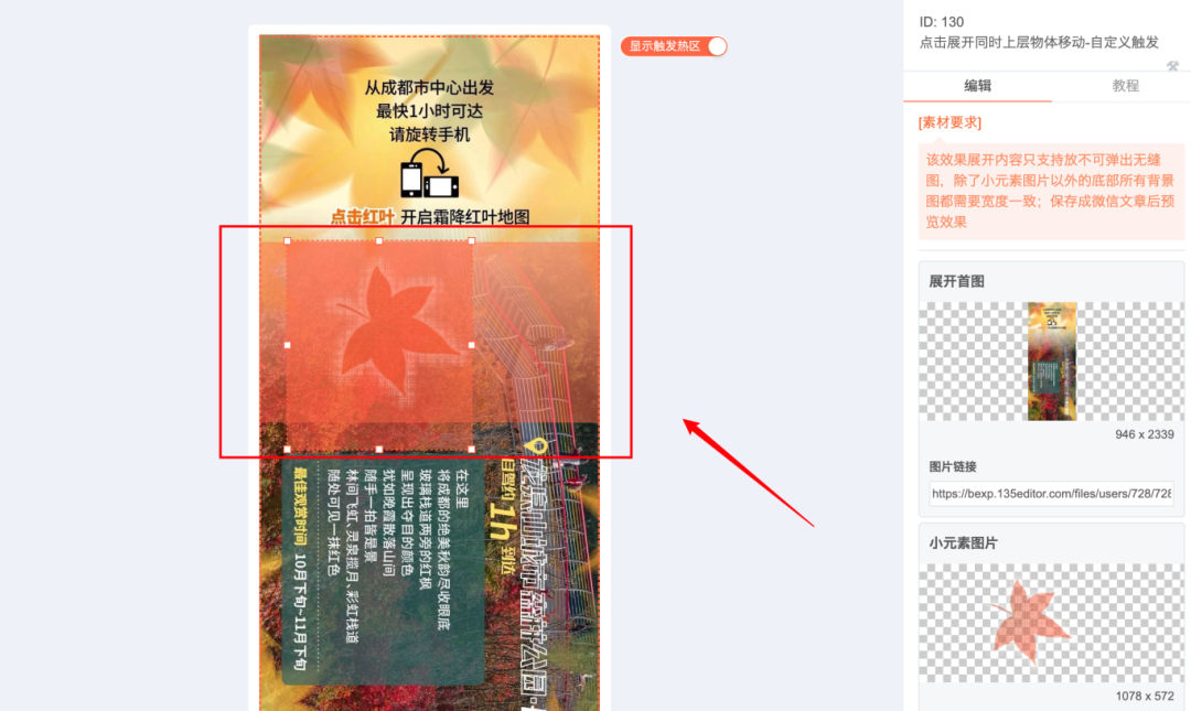 ①設(shè)置小元素的觸發(fā)區(qū):拖拽紅色區(qū)域的位置,放在元素圖的上方即可。