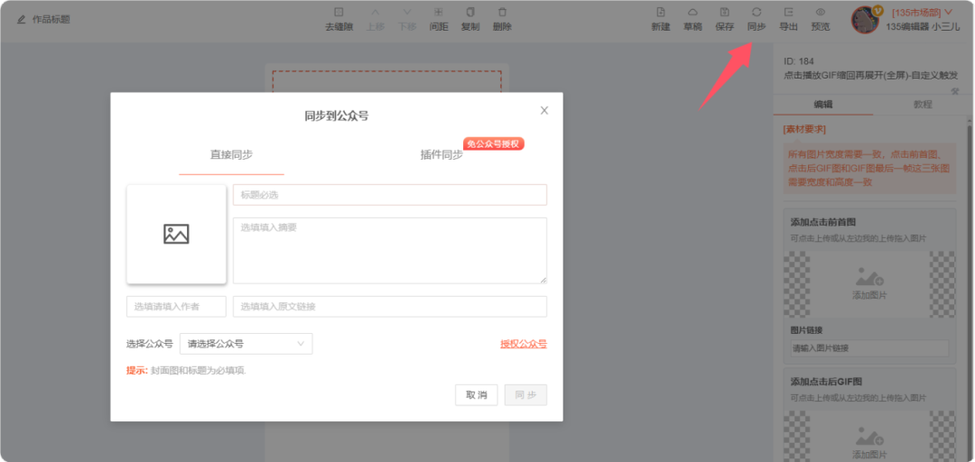 我們?cè)赟VG編輯器中制作好的SVG圖文怎么同步到微信公眾號(hào)后臺(tái)呢,如果我們授權(quán)了公眾號(hào),可以在SVG編輯器中選擇「同步」,在頁(yè)面按要求填寫內(nèi)容,選擇對(duì)應(yīng)的公眾號(hào)同步即可。