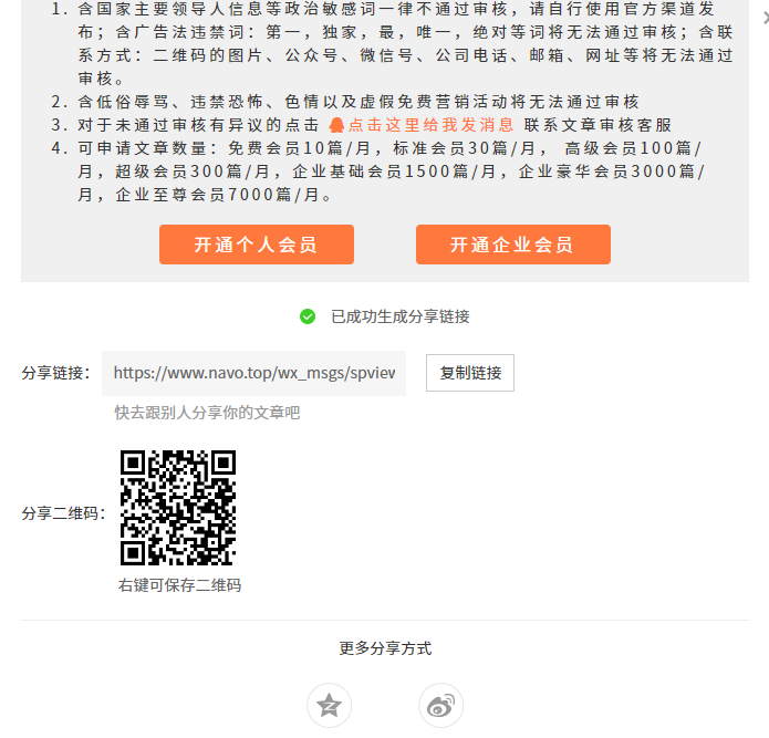 點(diǎn)擊分享按鈕后,選擇生成永久鏈接注意內(nèi)容要符合傳播規(guī)范,否則可能會(huì)生成鏈接失敗。