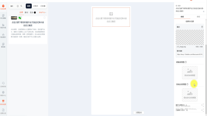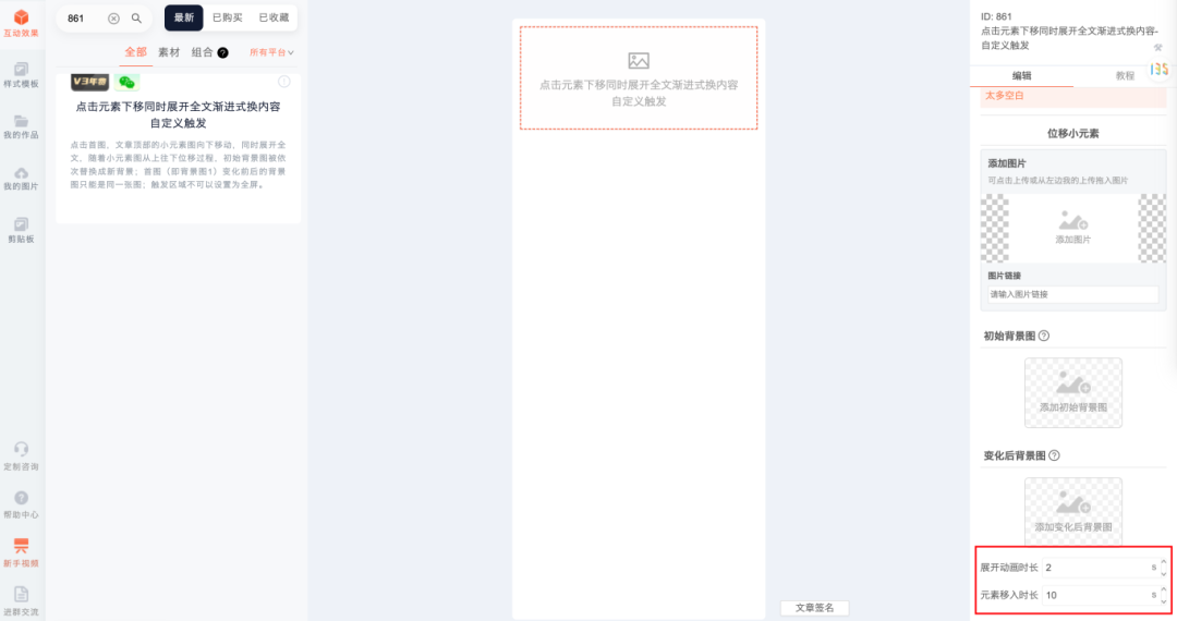 在編輯器找到「SVG互動效果」,點擊進(jìn)入SVG編輯器頁面,選擇「互動效果」在搜索框中搜索「點擊元素下移同時展開全文漸進(jìn)式換內(nèi)容-自定義觸發(fā)」或是組件ID:861
