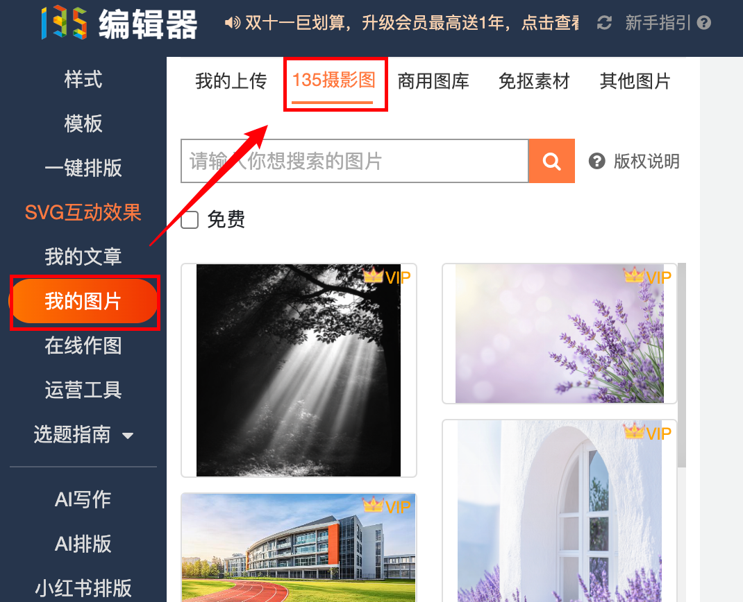 在編輯器頁(yè)面菜單欄的左側(cè)點(diǎn)擊【我的圖片】,在頂欄部分選擇【135攝影圖】。