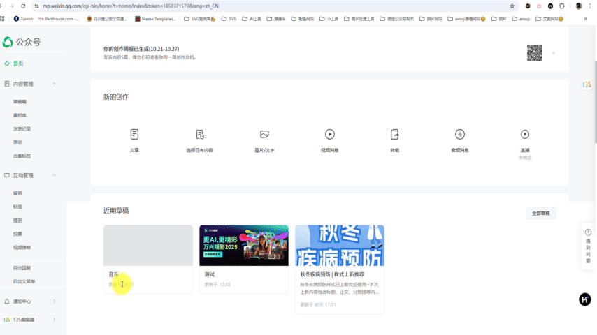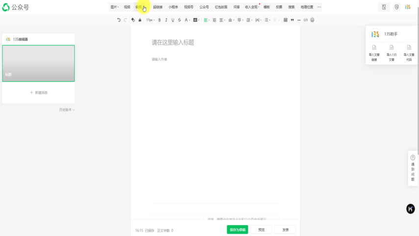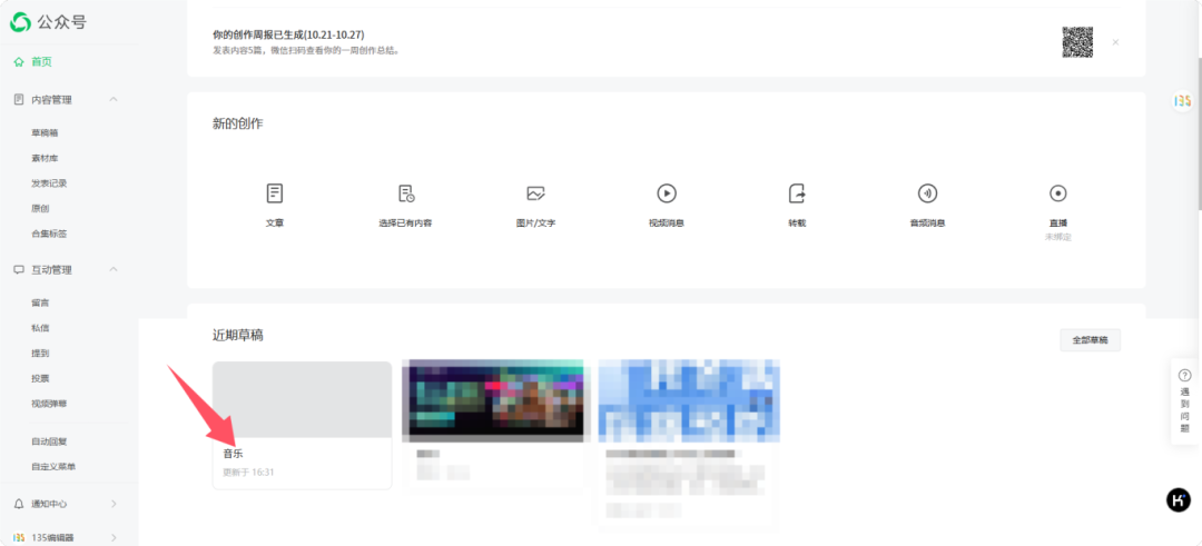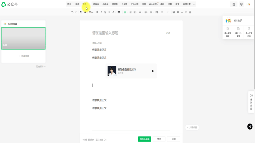 在微信公眾號后臺新建一篇文章,在文章中添加需要播放的音樂,點擊[保存為草稿]