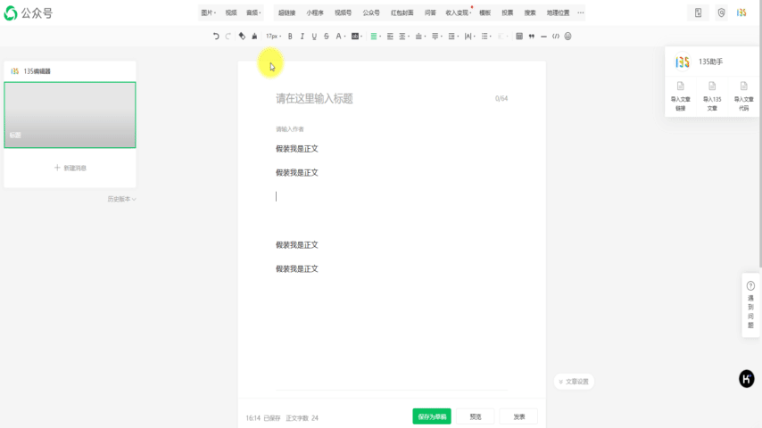 文章同步到微信后臺后,我們將鼠標停留在需要添加音頻的位置。