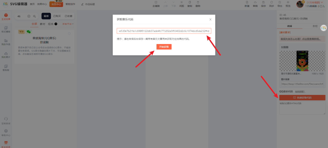 返回SVG編輯器頁面,點擊[快速獲取代碼],粘貼剛剛復(fù)制的鏈接,進行音頻代碼獲取。