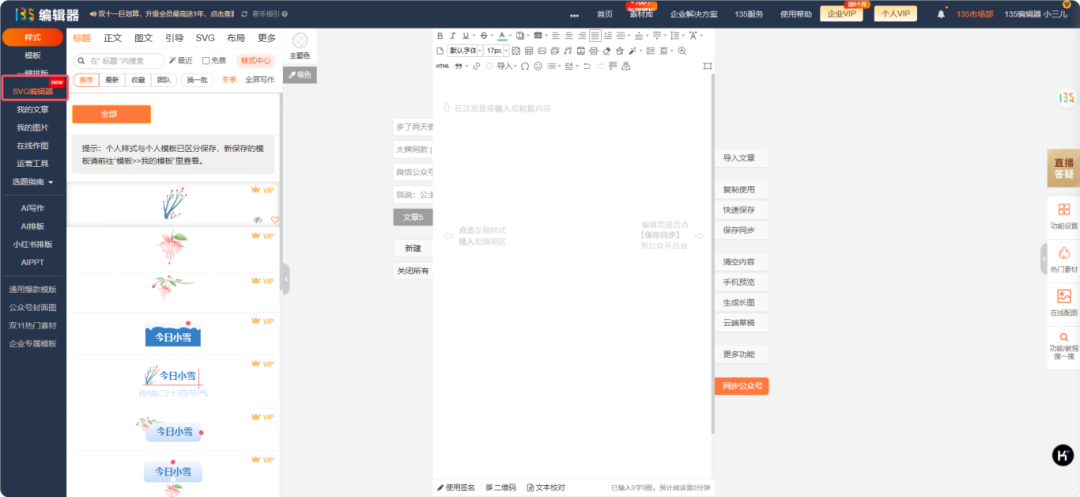 在135編輯器頁面,左側(cè)點擊[SVG編輯器]進入svg編輯器