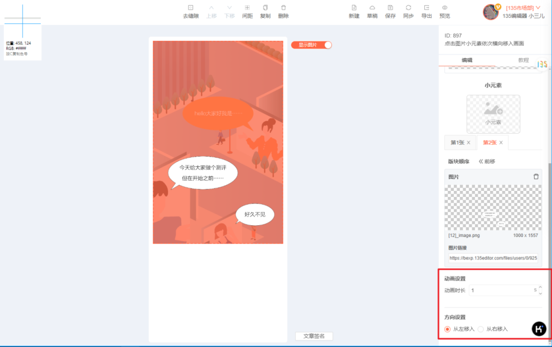 上傳好元素圖后,我們可以針對不同的小元素設(shè)置移入方向、動畫時長等內(nèi)容。