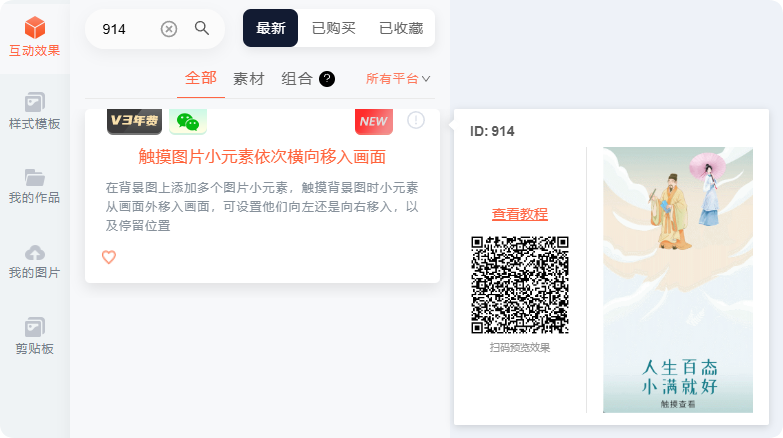 在SVG編輯器左側(cè)選擇「互動效果」,在搜索框中搜索組件:觸摸圖片小元素依次橫向移入畫面或組件ID:914