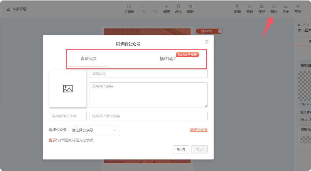 如果我們是在SVG編輯器里完成了一篇完整的文章,可以直接通過「同步」將內(nèi)容同步到微信公眾號后臺,當(dāng)然這個的前提是你需要向135編輯器授權(quán)你的賬號信息。