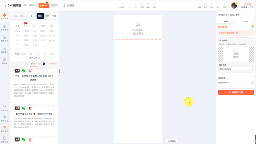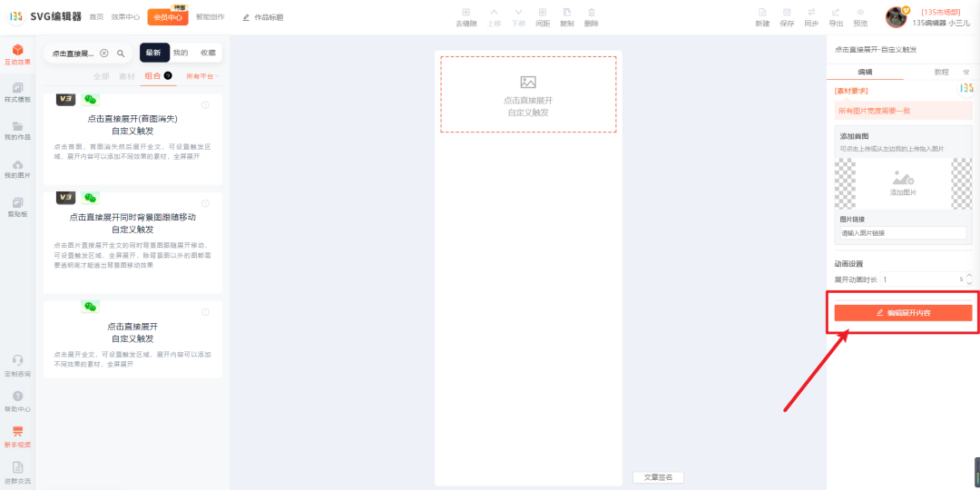 我們單擊其中一個組件到編輯區(qū)域后,就能看到[編輯展開內(nèi)容]選擇,而這里面我們就可以選擇需要添加的效果組件,包括但不限于輪播、點(diǎn)擊換圖、點(diǎn)擊跳轉(zhuǎn)小程序、滑動等