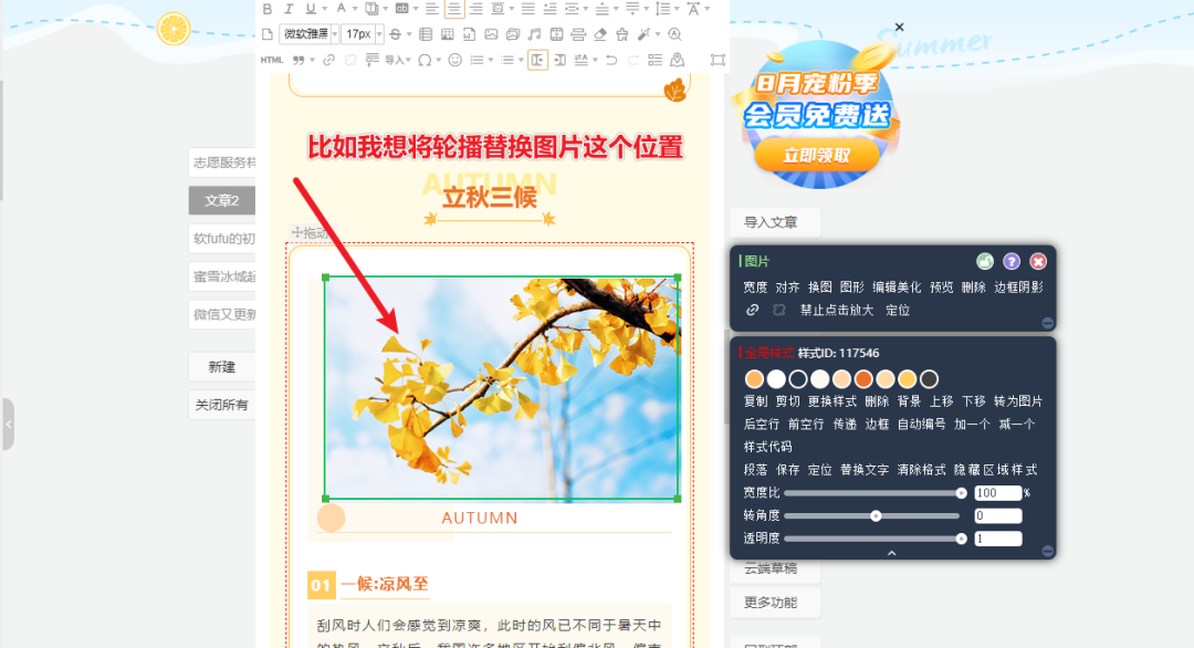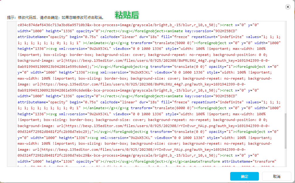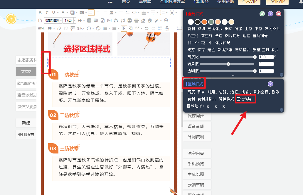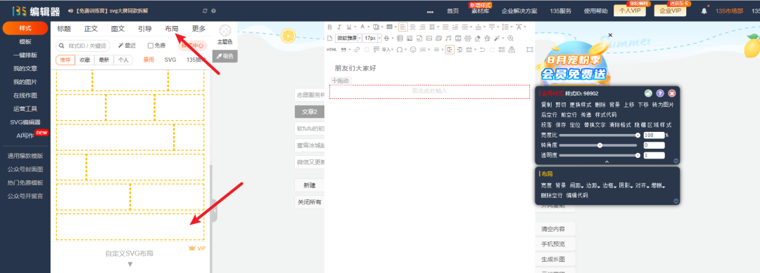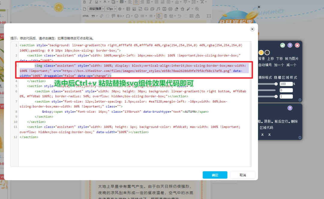 這時候我們已經(jīng)復(fù)制了SVG效果代碼,然后我們到135編輯器頁面,找到需要插入效果的位置的地方