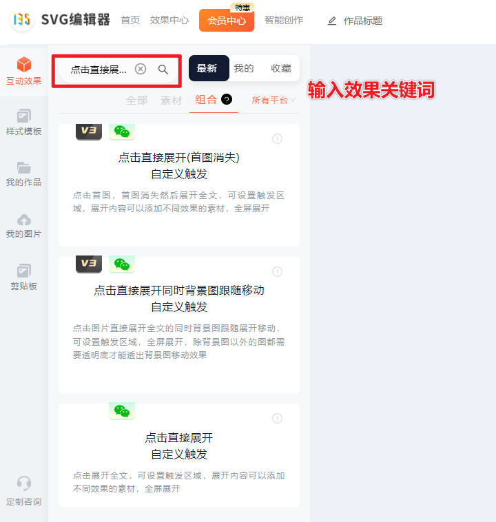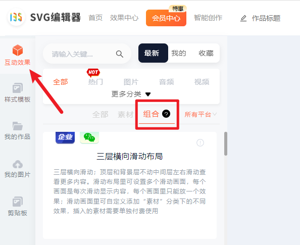 其實(shí)很簡單,在svg編輯器中我們需要先在[互動效果]然后找到[組合]