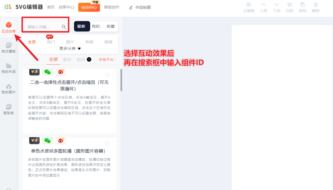 關(guān)于組件搜索,大家一定要讓[效果互動]高亮后,再在搜索框中輸入組件ID