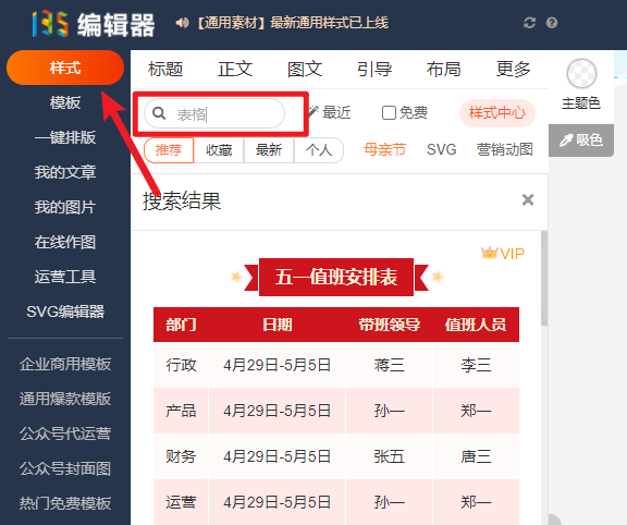 這里集合了我們所有的表格樣式,大家可以根據(jù)自己的需求選擇樣式使用,當(dāng)然大家也可以直接在[樣式]搜索框中搜索[表格]也可以搜索出豐富的表格樣式