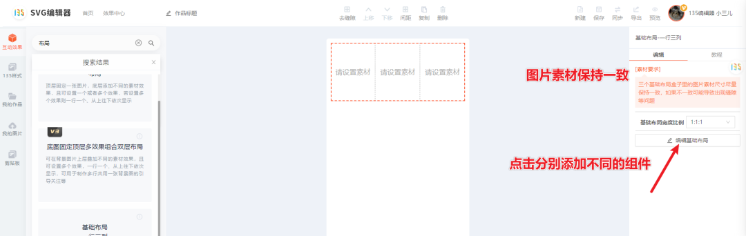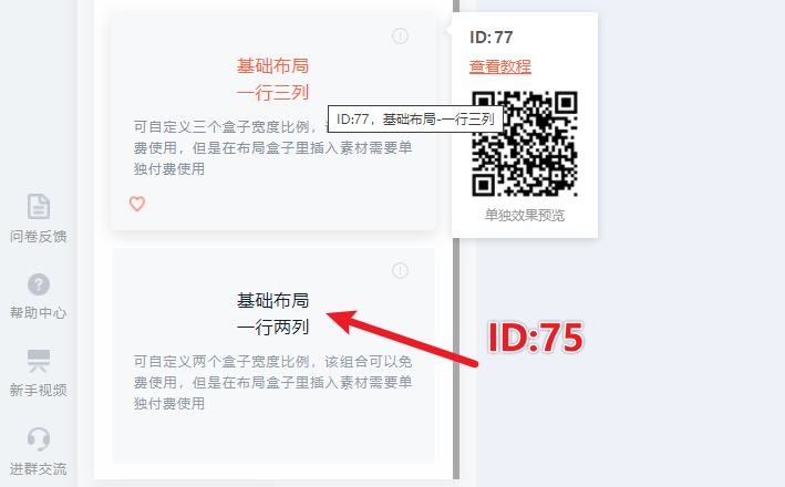 顯然我們需要更換svg組件,這一次我們選擇基礎(chǔ)布局:一行三列或一行兩列,ID:77、75。