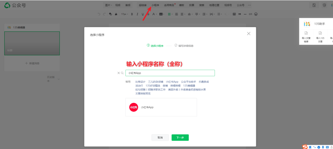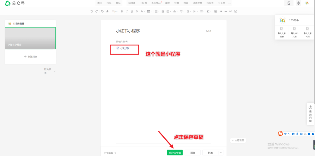 #微信后臺(tái)新建一篇文章插入小程序如:小紅書。