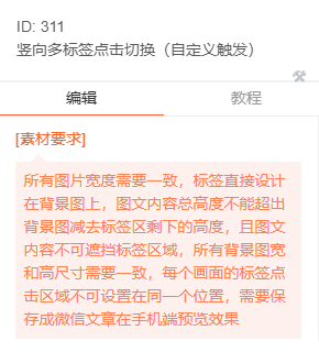 需要注意的是上傳的背景圖需要有點(diǎn)擊切換的標(biāo)簽,圖文內(nèi)容的高度,不能超過背景減去標(biāo)簽區(qū)域的高度。