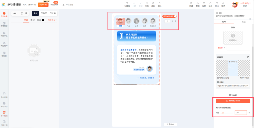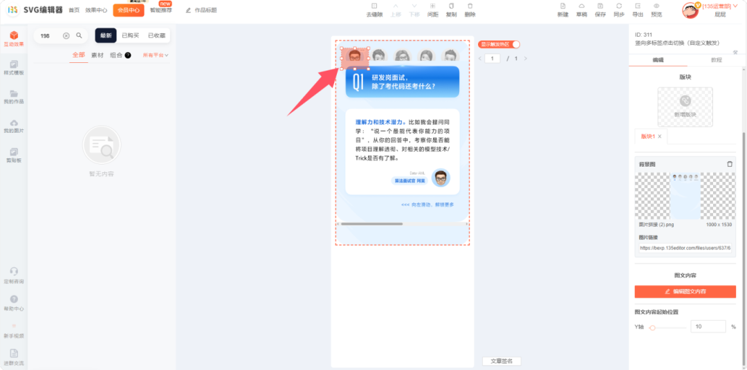 掌握新媒體運(yùn)營的高級技巧,學(xué)習(xí)如何在135編輯器中制作吸引眼球的無限選擇器效果。本文提供詳細(xì)步驟和圖解,教你如何通過SVG編輯器和互動組件,實(shí)現(xiàn)點(diǎn)擊標(biāo)簽切換內(nèi)容的動態(tài)效果。提升你的新媒體內(nèi)容互動性,讓讀者體驗(yàn)更上一層樓。