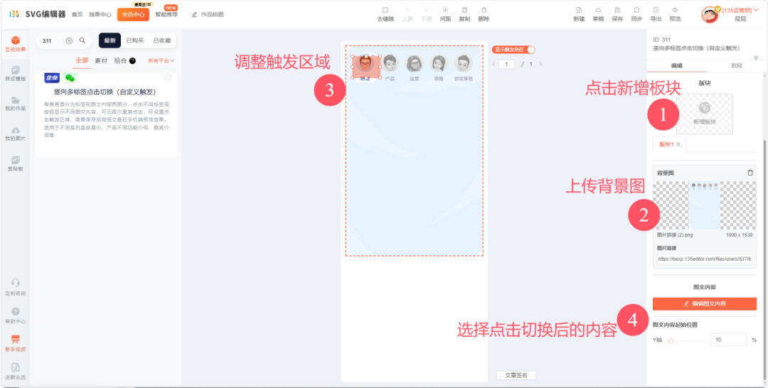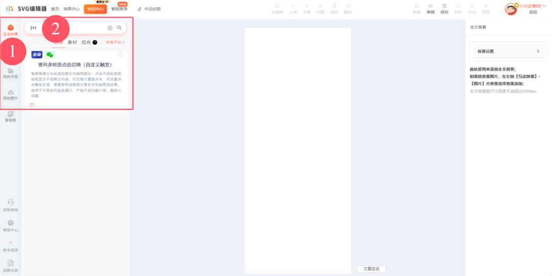 進(jìn)入SVG編輯器后在左側(cè)選中「互動效果」,在搜索框搜索組件豎向多標(biāo)簽點(diǎn)擊切換(自定義觸發(fā))或組件ID:311