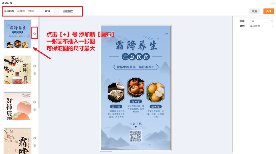 點擊【滑動布局】進入編輯頁面,插入一行單列布局,上傳圖片,設(shè)置布局格式,點擊【完成】即可。