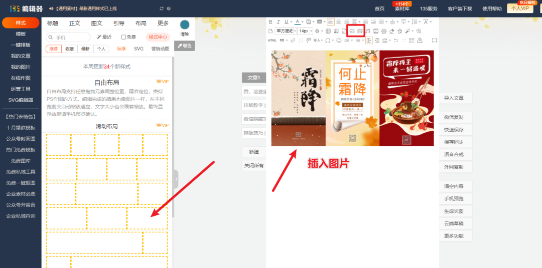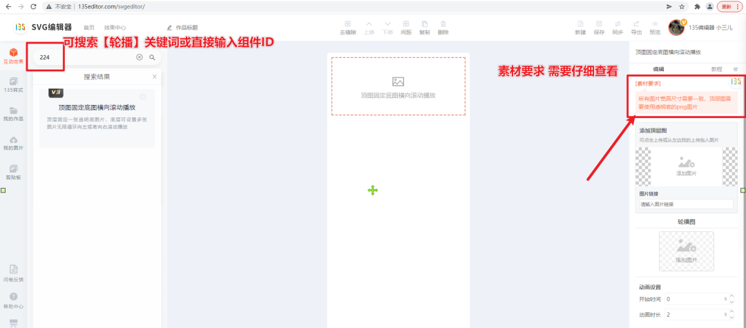 通過135編輯器頁面進入svg編輯器頁面,搜索關(guān)鍵詞【輪播】便可得到輪播相關(guān)的svg組件,根據(jù)每個組件具體要求上傳輪播素材。