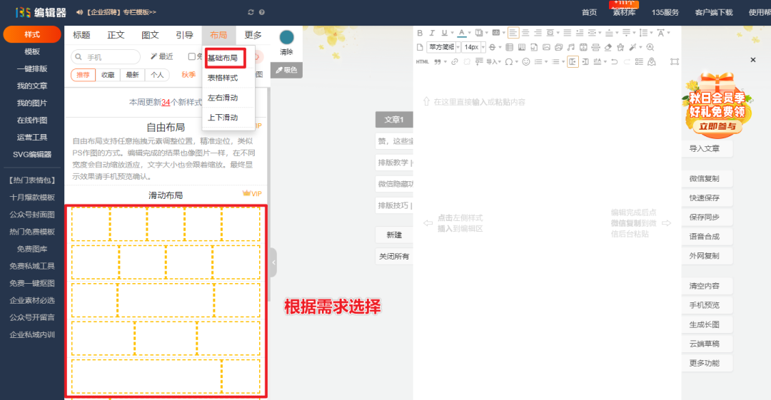 在編輯器頁面樣式展示區(qū)中的上方找到【布局】??【基礎(chǔ)布局】,根據(jù)各自的需求,選擇一行x列的布局選項。