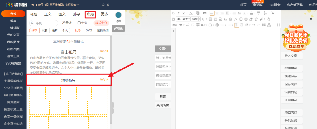 在編輯器頁面樣式展示區(qū)的上方找到【布局】??【滑動布局】