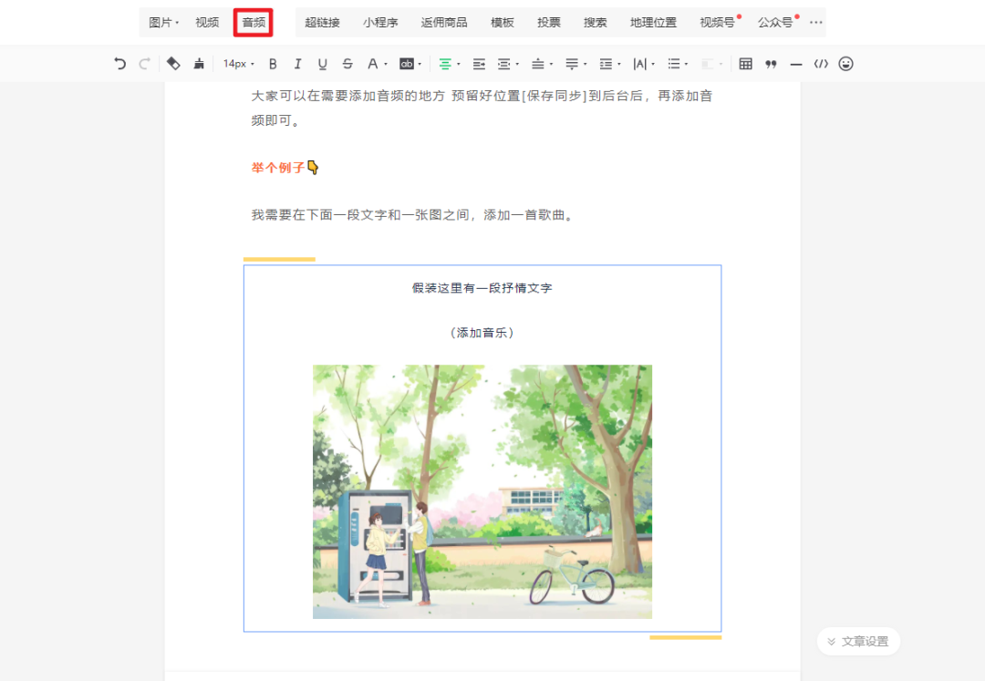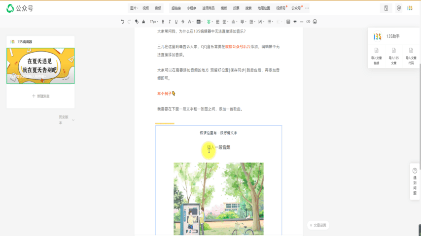前面兩種都是簡單在文章中直接添加音頻內容很直白,如果想要添加音頻海報又應該怎么做呢?