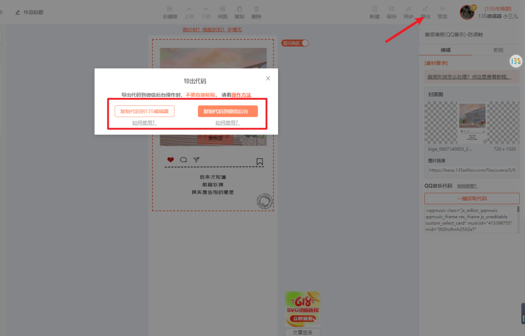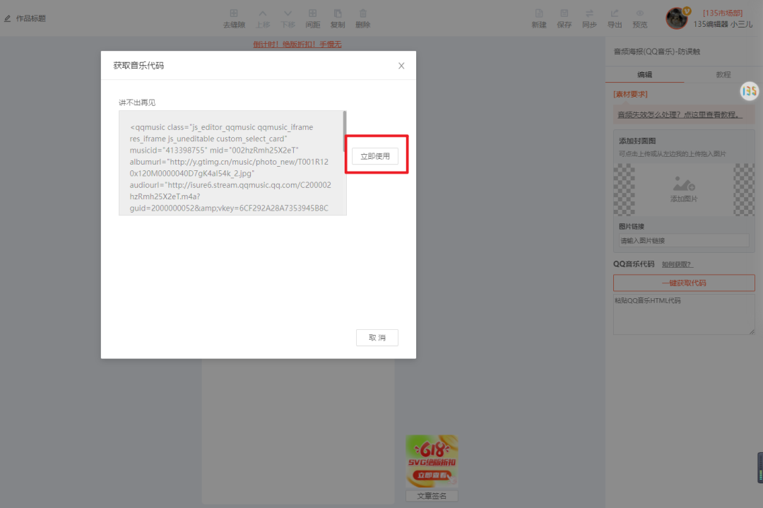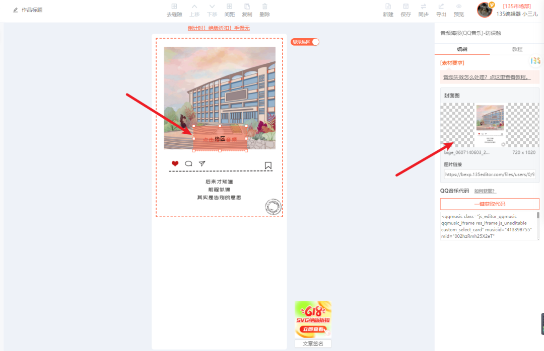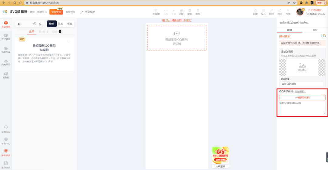 音頻海報其實很簡單,選擇正確的svg效果組件,譬如我們這里是用的是——音頻海報(QQ音樂)防誤觸,組件ID:46,我們需要兩個部分,音頻+海報,海報我們直接上傳就行,而音頻代碼應該如何獲取,難到了不少朋友。