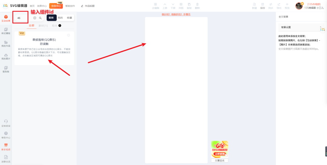 進入svg編輯后,輸入組件ID:46,將音頻海報組件添加進編輯區(qū)域。