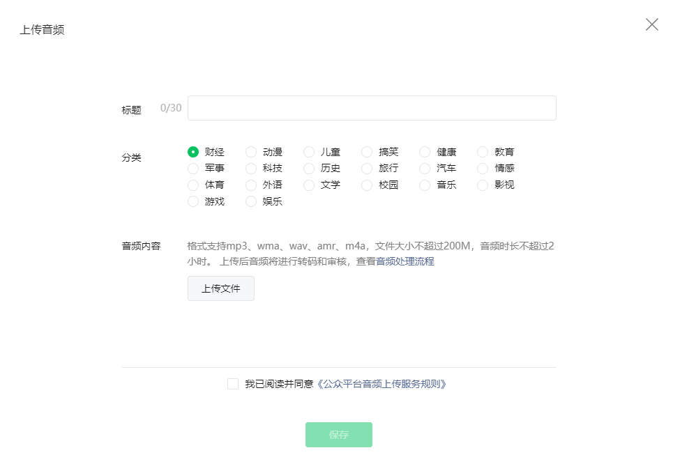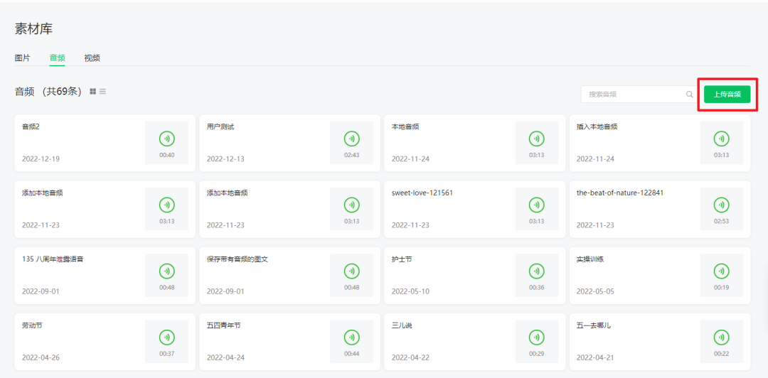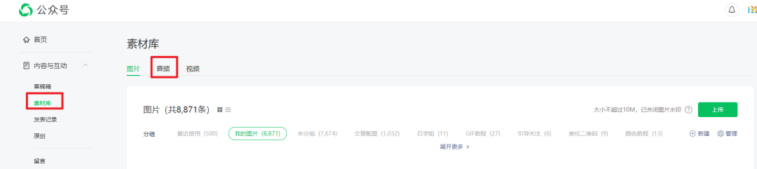 我們需要現(xiàn)在微信后臺的[素材庫]中,上傳自己的音頻內容,通過審核后,依舊在后臺編輯區(qū)上方找到[音頻]——[素材庫]選擇剛剛上傳的音頻素材即可。