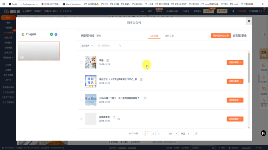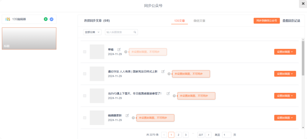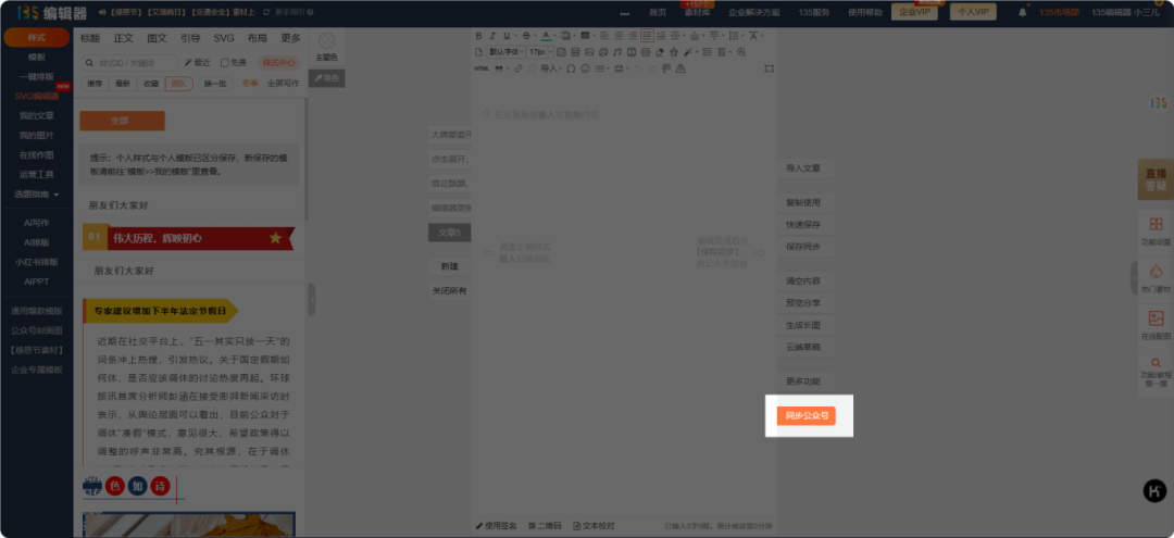 如果是面臨多篇內(nèi)容需要同步至微信后臺呢?這時候我們可以使用135編輯器右側(cè)的「同步公眾號」使用該功能需要先授權(quán)給135編輯器。