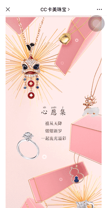 本期為大家?guī)淼膬?yōu)質(zhì)案例是CC卡美珠寶品牌的推文內(nèi)容《許個(gè)愿吧》,這篇文章是以新年愿望為主題,利用無限次點(diǎn)擊展開點(diǎn)擊回縮效果來介紹自己的珠寶產(chǎn)品。推文的首圖是一張精心設(shè)計(jì)的珠寶產(chǎn)品展示圖片。而具體的產(chǎn)品內(nèi)容則隱匿在首圖之下,需要用戶通過點(diǎn)擊之后才可了解,而每展開一個(gè)產(chǎn)品內(nèi)容則對(duì)應(yīng)一個(gè)新年愿望,比如醒獅的項(xiàng)鏈代表著一路發(fā)財(cái),與推文主題相呼應(yīng)。這樣的設(shè)計(jì)在保證排版美觀的同時(shí)又能與用戶形成很好的互動(dòng),下面就具體展開講解。