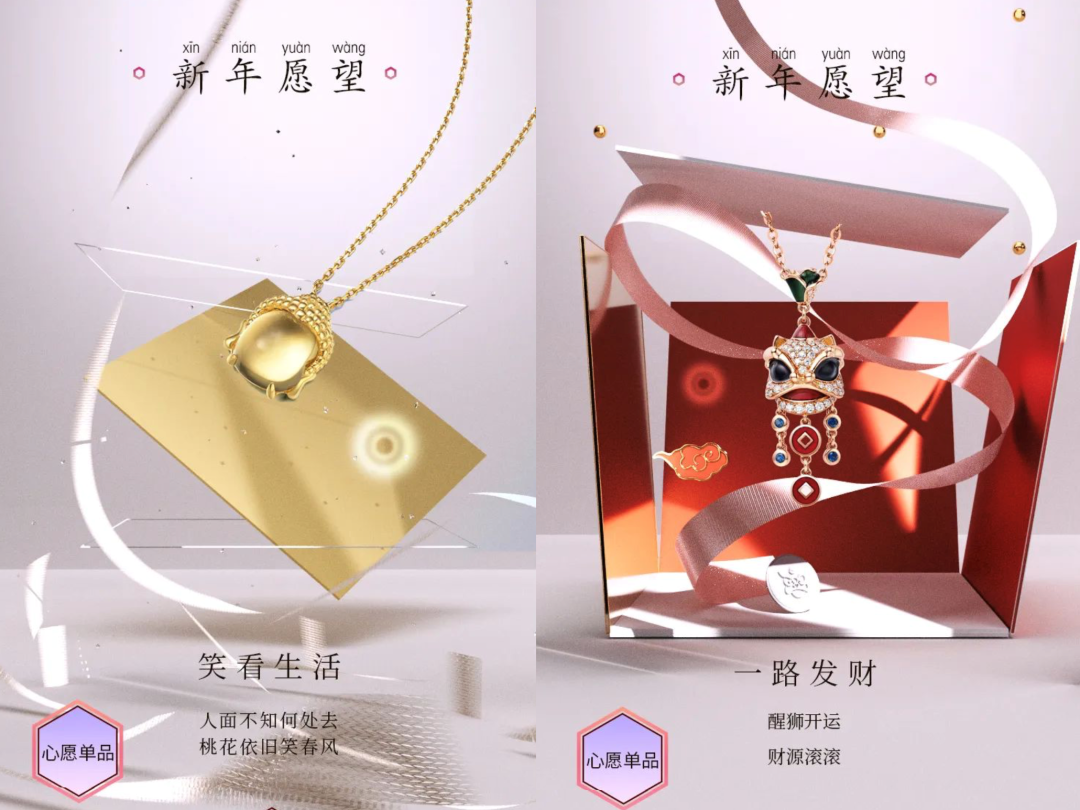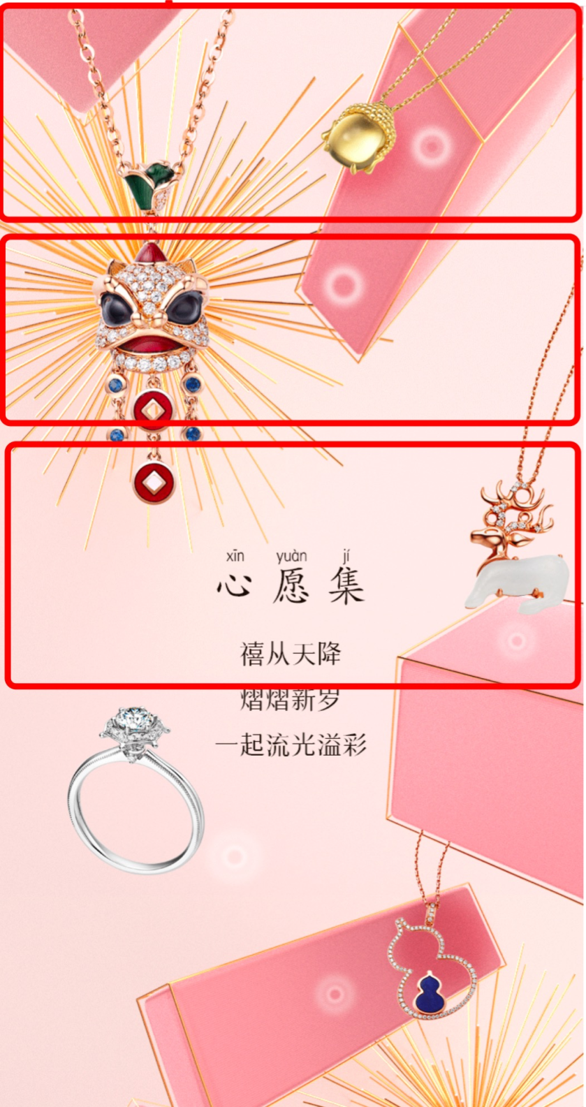 此效果在節(jié)省排版空間的基礎(chǔ)上,優(yōu)化了排版布局。如果將單個(gè)珠寶產(chǎn)品信息海報(bào)圖直觀的展示在推文中,整體看上去就會(huì)比較平淡,且每個(gè)單獨(dú)的產(chǎn)品海報(bào)銜接在一起,內(nèi)容上顯得很松散,不統(tǒng)一。但是將每個(gè)產(chǎn)品具體的信息隱匿在一張完整的海報(bào)之下,能夠在不破壞整體推文美觀度的情況下,盡可能展示更多的內(nèi)容。比如在該篇文章中將每部分展開的珠寶產(chǎn)品內(nèi)容對(duì)應(yīng)一個(gè)新年愿望:笑看生活、一路發(fā)財(cái)?shù)?,且產(chǎn)品的寓意與新年愿望的文案是有關(guān)聯(lián)的,整體設(shè)計(jì)巧妙。