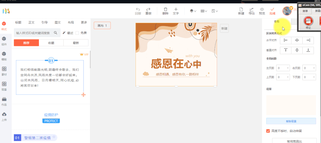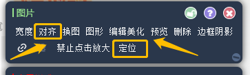 如果想在模板主體部分添加元素,可以將元素做成png的圖片形式,放到編輯頁(yè)面之中,再利用圖片面板的對(duì)齊形式/縮放和定位對(duì)圖片元素進(jìn)行位置調(diào)整。