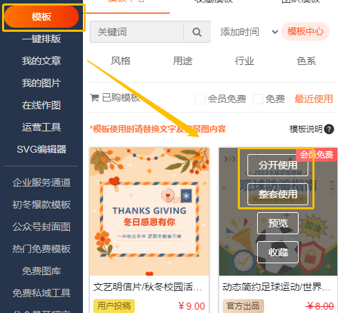 在左側(cè)菜單欄的【模板】板塊中,將鼠標(biāo)輕放在每個(gè)模板上。會(huì)出現(xiàn)【整套使用】和【分開(kāi)使用】,如果你想用整個(gè)模板,可以選擇【整套使用】,但如果你只想用該模板的某部分,則選擇分開(kāi)使用,這時(shí)這個(gè)模板就會(huì)被拆解成多個(gè)部分顯示,點(diǎn)擊你需要的部分放到編輯頁(yè)面之中即可。