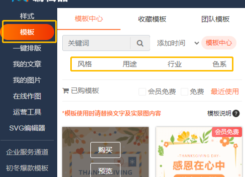 ① 第一種,在編輯頁(yè)面的左側(cè)菜單欄有【模板】的選項(xiàng),點(diǎn)擊進(jìn)入就可以看到各種模板,并且還可以按照風(fēng)格、用途、行業(yè)、色系等進(jìn)行篩選。