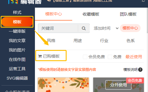 當(dāng)你購(gòu)買(mǎi)了模板中心的模板,想查看和使用時(shí)同樣可以通過(guò)左側(cè)菜單欄【模板】界面,然后點(diǎn)擊【已購(gòu)模板】找到。