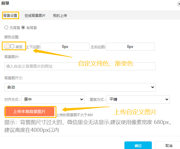 自定義背景:如果你想要用自己設(shè)計(jì)好的背景圖或者自定義純色背景,可以在咱們的【背景設(shè)置】中進(jìn)行設(shè)置,調(diào)整背景顏色以及上傳自己設(shè)計(jì)好的背景圖。