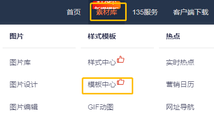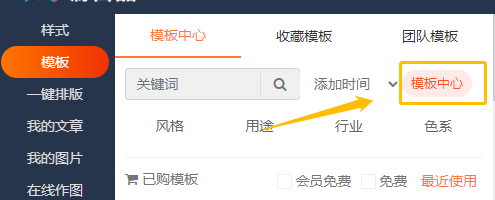② 第二種,是進(jìn)入到【模板中心】搜索查看模板,有兩個(gè)入口:在頂部導(dǎo)航欄的【素材庫(kù)】—【模板中心】進(jìn)入,也可以通過(guò)左側(cè)菜單欄的【模板】界面的【模板中心】進(jìn)入。在模板中心能夠更直觀、全面看到各類模板,可篩選的標(biāo)簽更加廣泛。