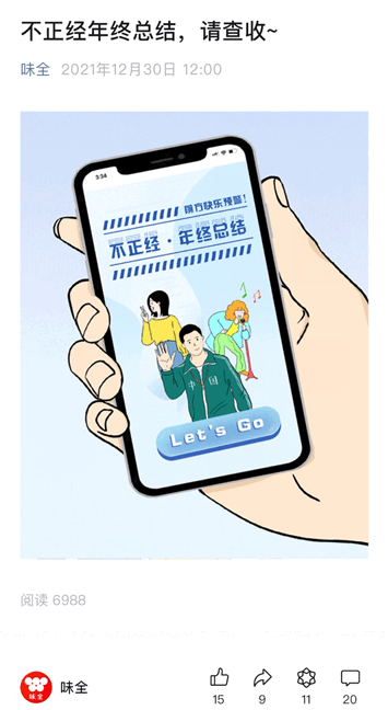 味全的這篇年終總結(jié)主題的推文角度新穎,他們以盤點年度熱梗詞的方式,將熱梗詞的釋義與自身產(chǎn)品的特色相融合,巧妙地向用戶展示了他們的產(chǎn)品。這樣不僅緊密貼合了年終總結(jié)的氛圍,而且還達(dá)到了良好的產(chǎn)品宣傳效果。