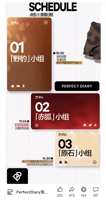 此推文引領(lǐng)讀者回溯了該品牌的年度彩妝佳作,巧妙地將這些產(chǎn)品依據(jù)主題劃分展示,諸如“野豹小組”、“赤狐小組”等。本文在設(shè)計層面尤為亮眼,整體版面布局簡潔明快,營造出如同翻閱時尚雜志般的視覺享受。在商品圖片呈現(xiàn)環(huán)節(jié),采用了3D視覺效果,并通過刻意放大產(chǎn)品比例,制造出了強(qiáng)烈的視覺沖擊力,緊緊吸引用戶的目光。